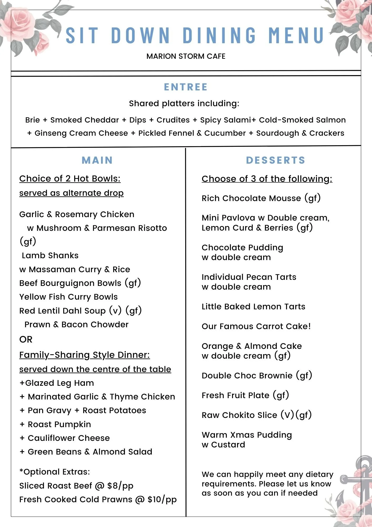 Optional extras: Sliced Roast Beef +$8 pp | Fresh Cooked Cold Prawns +$10 pp