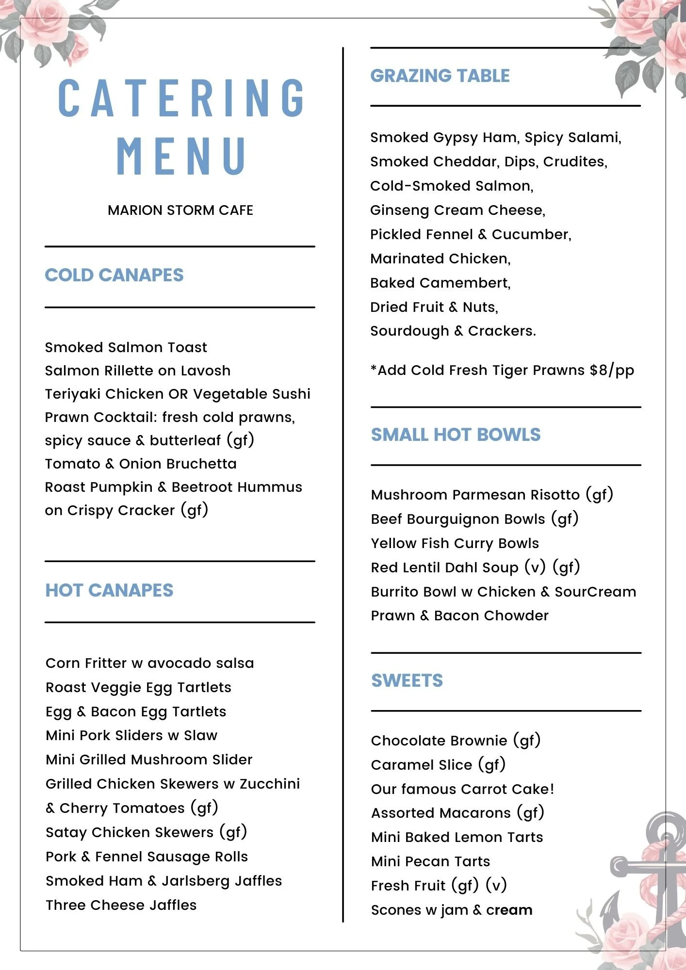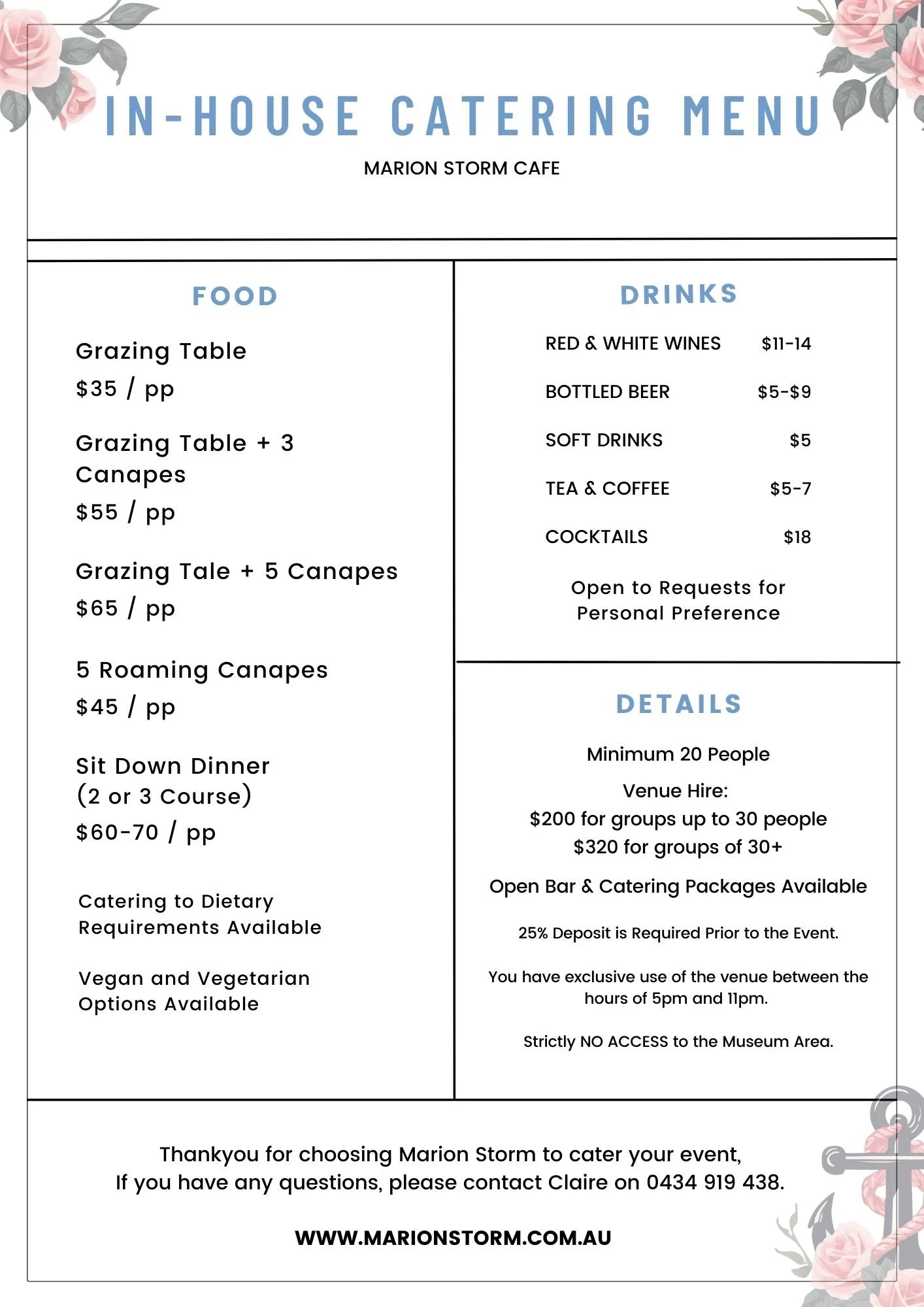 If you would like to enquire about catering and/or hosting for your next event, please email admin@marionstorm.com.au, complete the form, or contact Claire on 0434 919 438, with any questions or specific requests.